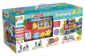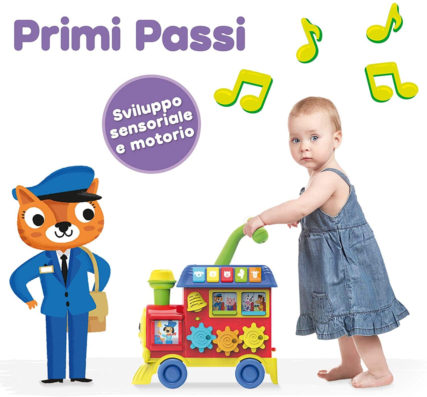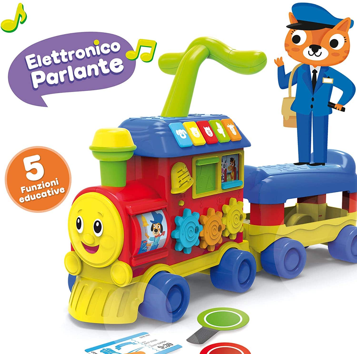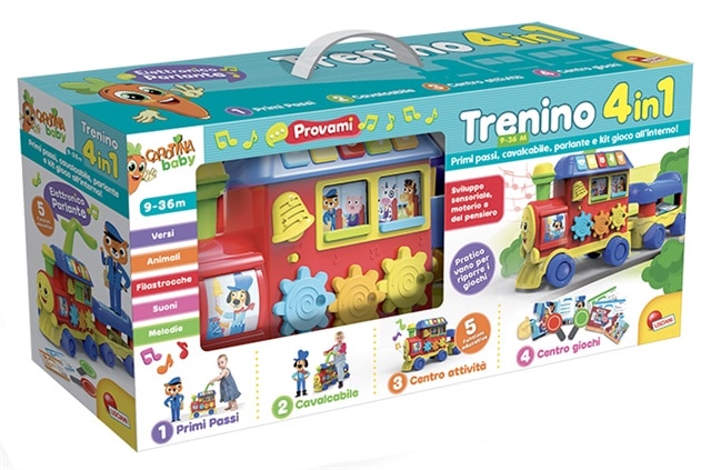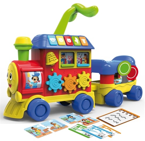 Il nuovo divertente trenino 4 in 1, primi passi, cavalcabile, elettronico parlante e con un ricco kit di giochi! Il materiale del kit può essere comodamente riposto nel pratico vano portagiochi del trenin