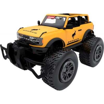 – Carrera RC Ford Bronco – Carrera RC Off-Road – Il mitico Ford Bronco in versione Carrera RC – Ca. 40 cm di lunghezza – Da 6 anni Il mitico Ford Bronco riportato in azione con Carrera RC Ora, con Carrera RC, puoi partire a tutta velocità con questo sogno della storia americana dei fuoristrada. Il Ford Bronco, con il suo look squadrato, ha spopolato per le strade sin dagli anni ’60 e ora ritorna con il nuovo modello presentato nel 2020. Con questo veicolo Carrera RC non solo sei il re delle strade, ma ti meriti anche il titolo di leggenda dei fuoristrada. Il design retrò con grandi fari rotondi, la carrozzeria squadrata e i grandi pneumatici lo rendono una vera calamita per gli sguardi, in strada e al parco o in giardino; d’altronde con il Ford Bronco Carrera RC puoi affrontare qualsiasi terreno. Puro divertimento con l’eccellente equipaggiamento tecnico proprio come nella versione a grandezza reale Questo modello, lungo ca. 40 cm e dal vivace color arancione, grazie alla protezione dagli spruzzi d’acqua è perfettamente attrezzato anche per attraversare pozzanghere. La tecnologia di comando Digital Proportional da 2.4 GHz permette di pilotare il fuoristrada con pneumatici extra grandi in ogni angolo sterzando in continuo. La batteria LiFePo4 da 6,4 V 900 mAh garantisce un tempo di marcia fino a 40 minuti.