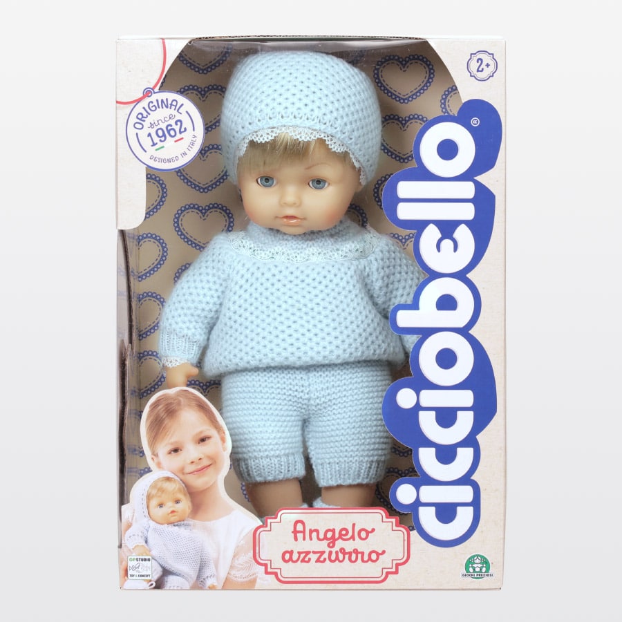 Cicciobello Angelo Azzurro è stata la prima versione di Cicciobello, lanciata nel 1962. Nonne, mamme e ora le loro figlie troveranno in questa versione un caro amico in grado di far rivivere magici ricordi e dal quale non separarsi mai più.