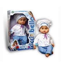 Un nuovo, simpatico Cicciobello, ispirato al mito dei grandi Chef, con tipica vestizione da cuoco, completa di cappello e arricchita da dettagli glitterati. Funzione piangente. Ciuccio incluso.