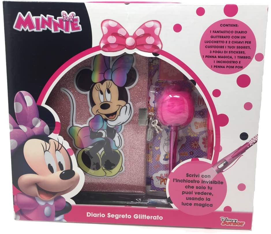 Diario segreto glitterato. Contiene il diario con luchetto, 1 penna con ponpon, 1 penna magica, 1 timbro inchiostro, 3 fogli di sticker adesivi.