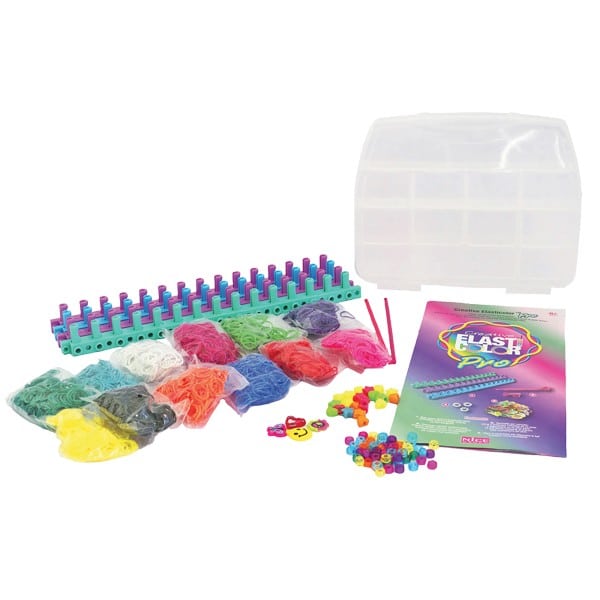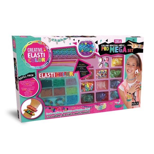 Un MEGA set dell’ORIGINALE telaio ELASTICOLOR PRO con ricchissimo assortimento di elastici e accessori colorati. Contiene una graziosa ed utile valigetta per conservare tutto in ordine! NOVITA di questo kit sono i 4 graziosi CHARMS di gomma: per rendere le tue creazioni ancora più particolari. DIVERTITI A CREARE SEMPRE NUOVI ACCESSORI ALLA MODA ORA ANCHE CON GLI ELASTICOLOR CHARMS! Il mega set contiene:1 telaio ELASTICOLOR PRO 4 file, 1 valigetta media, 2400 elastici (colori assortiti), 2 uncinetti e 1 mini uncinetto, 50 clips di chiusura, 300 perline assortite e un fascicolo di istruzioni illustrate per i primi 5 braccialetti base. Gli elastici e i componenti ELASTICOLOR SONO SICURI e CONFORMI alla Normativa Europea che regola questo tipo di prodotti (EN 71 part 1-2-3-9, Ftalati, ROHS).