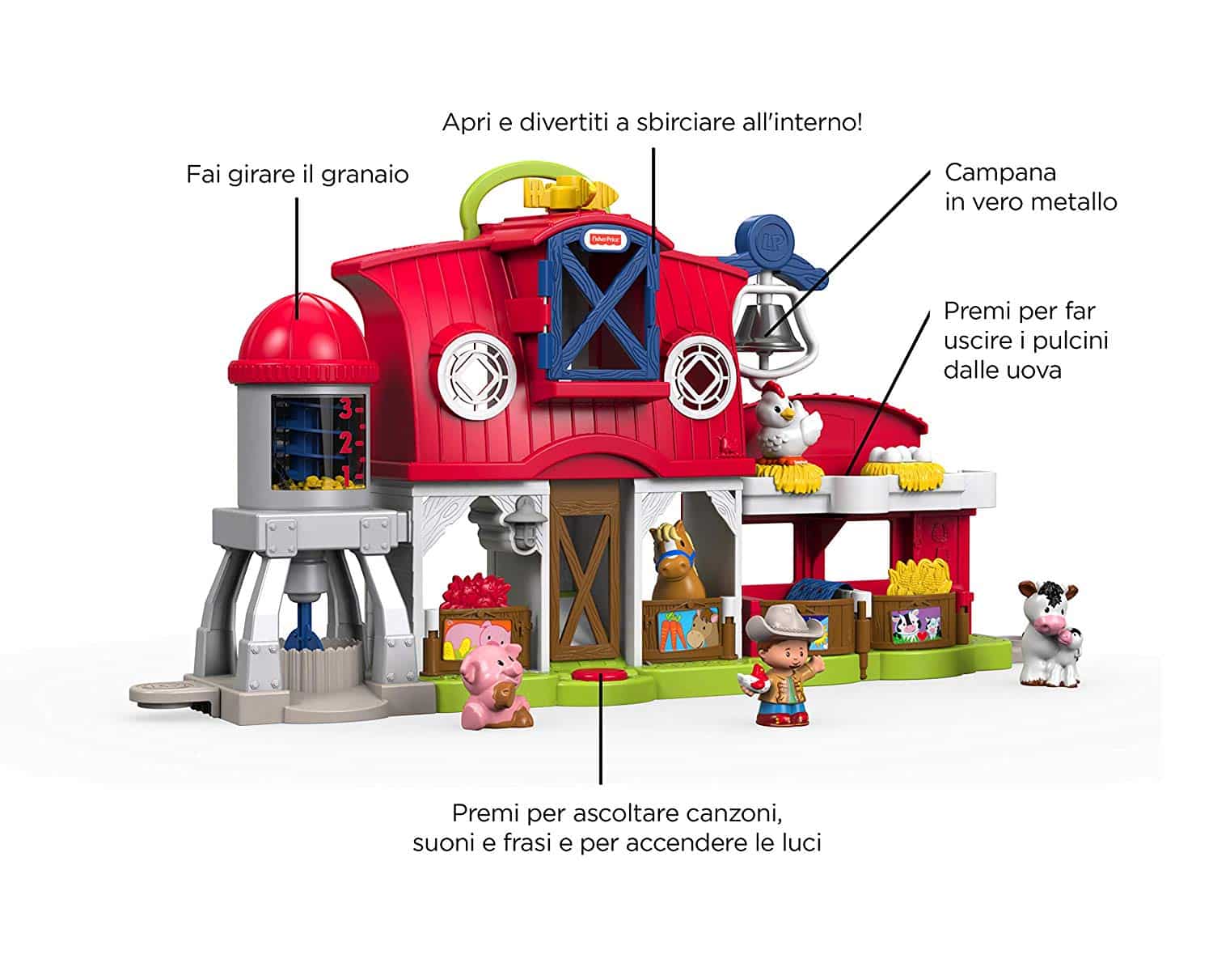 La Fattoria degli Animali Felici Little People Fisher-Price è un playset ricco di attività per bambini di 1 anno e in età prescolare. Con un fienile, un maiale, una gallina, una mucca, un vitello e il fattore Jed, questo set giocattolo della fattoria insegna ai bambini come prendersi cura di tutti gli amici animali, dal dare da mangiare il granturco alle galline al mettere una morbida coperta sul cavallo. Grazie ai diversi spazi di gioco e alle funzioni interattive, i vostri piccoli fattori si divertiranno a fare giochi di ruolo creativi con le attività da fattoria. I bimbi possono chiamare gli animali suonando la campanella in metallo, girare il silo per prendere il granturco per le galline, aprire la porta della stalla per far uscire i cavalli al pascolo e persino far scivolare i personaggi dal fienile per un divertimento senza limiti. Inoltre, premendo i pulsanti, possono attivare canzoni e suoni divertenti che insegnano come prendersi cura degli altri. La Fattoria degli Animali Felici Little People Fisher-Price è più che una fattoria, è una casa per tutti i nuovi amichetti del vostro piccolino.