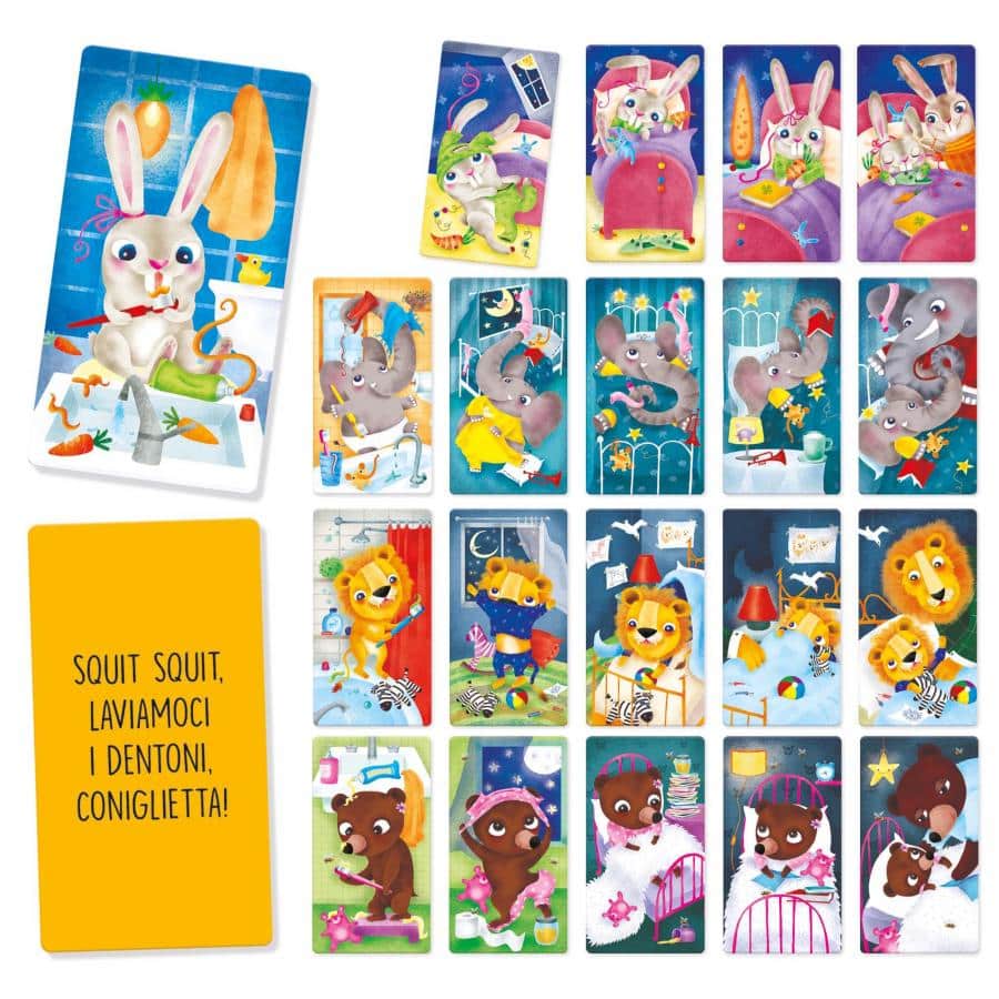 Ti sei lavata i denti, Coniglietta? Elefantino, ti sei messo il pigiama? Papà Leone, mi rimbocchi le coperte? Venti carte illustrate che accompagnano i bambini durante il rito della buona notte giocando in modo tenero e creativo con mamma e papà!