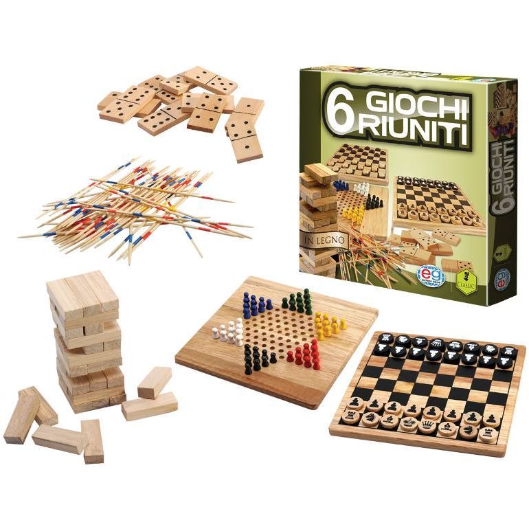 Spin Master Editrice Giochi 6037248 – Giochi Classici da tavolo – 6 Giochi Riuniti in Legno. Sei giochi classici in legno per tutta la famiglia. Dama & Scacchi, Dama Cinese, Domino, Shangai e Jumnling tower per un divertimento senza fine. La confezione contiene 1 plancia in legno con la griglia per la dama e gli scacchi da un lato e i 121 fori per la Dama Cinese dall’altro, 60 pedine colorate in plastica, 32 gettoni in legno raffiguranti da un lato le pedine degli scacchi e dall’altro le pedine della dama, 28 tessere in legno domino, 48 mattoncini in legno torre, 31 bastoncini in legno Shangai/Mikado. Da 2 a 6 giocatori.