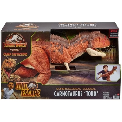 Preparati ad azioni e avventure super elettrizzanti con Jurassic World Dino Escape! Ispirato alla serie Jurassic World Dalla serie Camp Cretaceous Nuove Avventure, questo Carnotauro ‘Toro’ Super Colossale ha dimensioni ENORMI e può INGHIOTTIRE MINI ACTION FIGURE PER INTERO! Deve solo masticarle! Dopodiché allenta il fermo sulla pancia e potrai liberarle tutte e ricominciare con una nuova storia da carnivoro! Ha inoltre fattezze, dettagli e colori autentici. Un regalo fantastico per i bambini dai 4 anni in su, soprattutto se sono fan di Jurassic World, dei dinosauri e del gioco d’azione. Colori e decorazioni possono variare