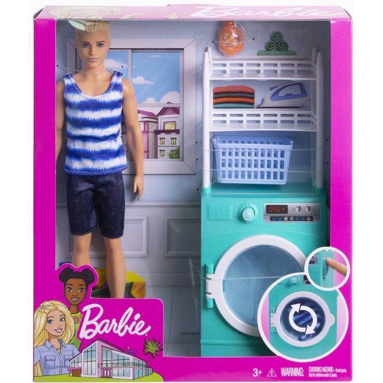 Mattel Lavanderia di Ken, Bambola e Lavatrice/Asciugatrice con Cestello Rotante e 2 Accessori, FYK52. Ken è pronto per fare il bucato con questo playset lavanderia di Barbie. Include Ken, un complemento di arredo e accessori che permettono ai bambini di controllare l’azione e inventare nuove storie grazie anche a nuove funzionalità realistiche. Il set lavanderia di Ken include una lavatrice/asciugatrice dotata di manopola funzionante, semplice da utilizzare con le manine dei bambini, e il cestello che gira davvero. Gli accessori aggiuntivi ispirano nuove storie. Alcuni accessori sono dotati di impugnature che si adattano alle mani delle bambole o di design attacca e stacca in grado di tenerli in posizione, per un gioco ancora più realistico e una facile pulizia! I bambini adoreranno sbrigare le faccende domestiche con Ken e scoprire che quando giocano con Barbie possono immaginare di diventare tutto ciò che desiderano! Include Ken con abiti e scarpe, lavatrice/asciugatrice con ripiano, una cesta per il bucato e una bottiglia di detersivo. La bambola non può reggersi in piedi da sola. Colori e decorazioni possono variare
