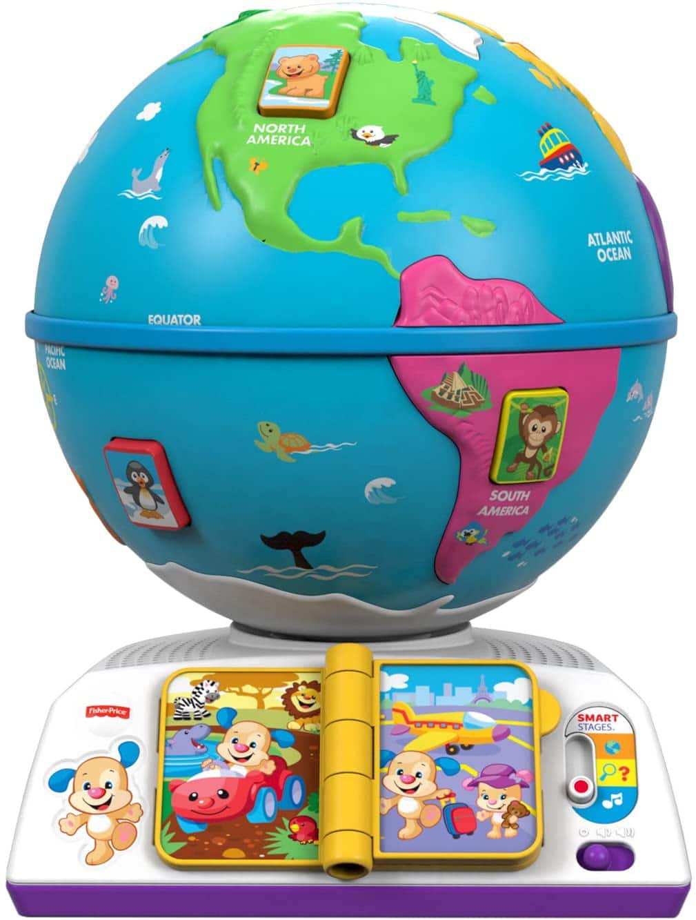 Con questo mappamondo interattivo, i bambini potranno avere il mondo tra le mani per esplorarlo e farlo volteggiare! Premendo i 7 pulsanti degli animali del mappamondo, i piccoli esploratori vengono introdotti ai nomi dei continenti, agli animali, ai saluti e alla musica che incontreranno strada facendo! Girando le pagine del libretto di viaggio impareranno come Cagnolino e Sorellina viaggiano per il mondo. E girando il mappamondo potranno ascoltare allegre canzoncine e frasi dedicate all’esplorazione di varie destinazioni.
