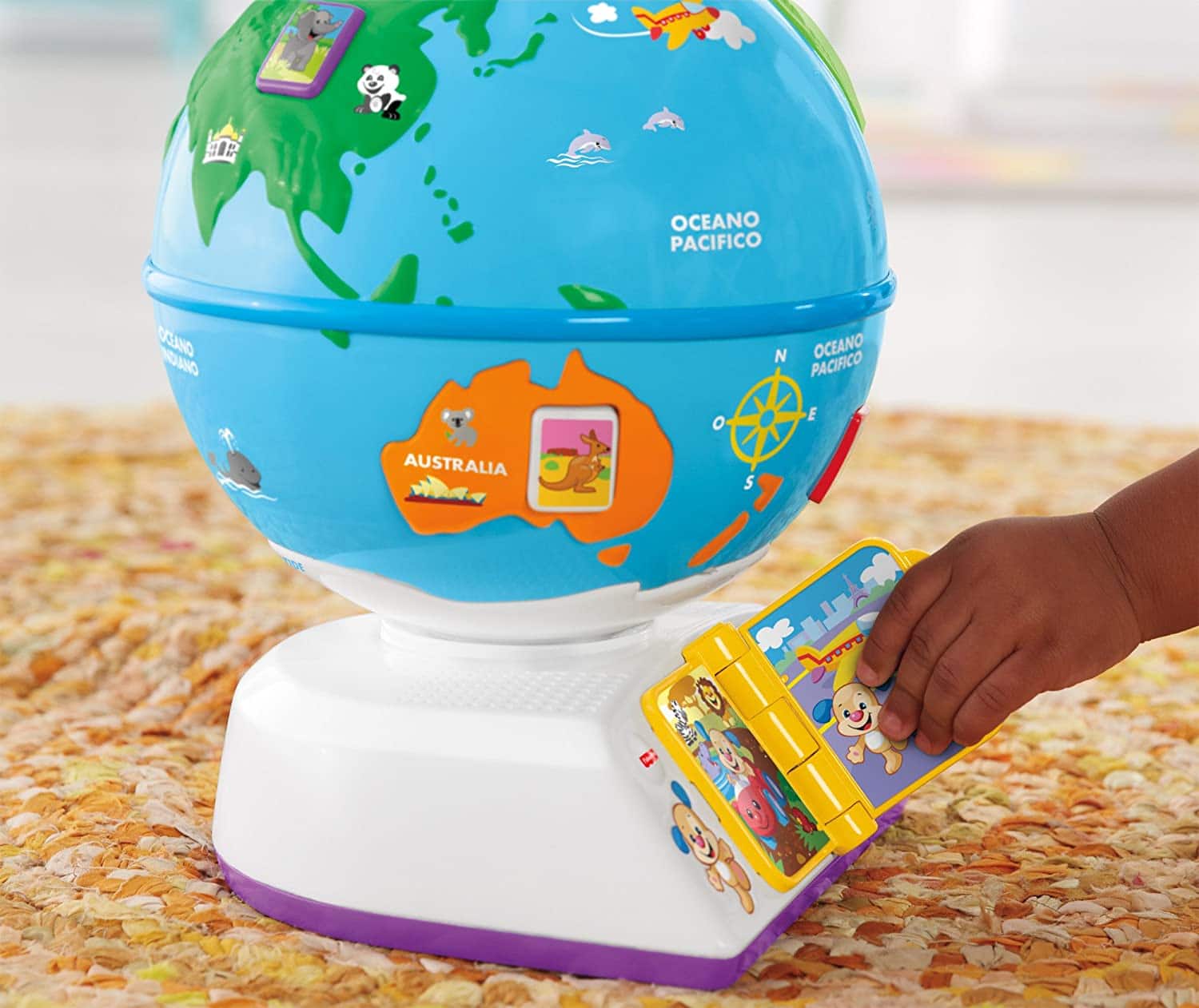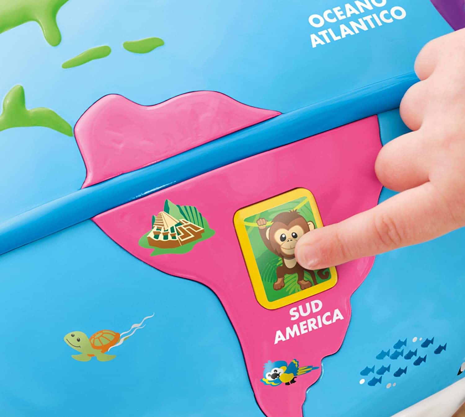 Il mappamondo interattivo aiuta ad insegnare i diversi saluti del mondo, gli animali, i colori, i mezzi di trasporto, la musica e i continenti.