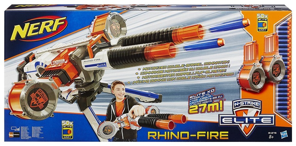 Scatena un’irresistibile valanga di fuoco sui tuoi avversari e crea una barriera invalicabile per qualsiasi offensiva! Rhino-Fire è un poderoso blaster motorizzato N-Strike a doppia canna, capace di sparare in rapida successione come una vera mitragliatrice i dardi N-Strike che sibilano minacciosi nell’aria! Rhino-Fire è dotato di 2 capienti tamburi laterali da 25 dardi ciascuno, per far cambiare idea a qualsiasi malintenzionato. Le due canne si muovono alternativamente avanti e indietro con un effetto straordinariamente realistico! Imbraccia Rhino-Fire e affronta i tuoi amici senza paura, oppure stenditi a terra, appoggia il blaster sul treppiede in dotazione, prendi la mira e respingi qualsiasi attacco! Rhino-Fire spara i suoi 50 dardi Elite fino a oltre 25 metri di distanza per cogliere di sorpresa anche gli avversari più lontani e dare vita a sfide all’ultimo respiro! Se fai parte delle truppe d’assalto più forti e determinate e hai un età da 8 anni in su, Rhino-Fire deve fare assolutamente parte del tuo equipaggiamento!