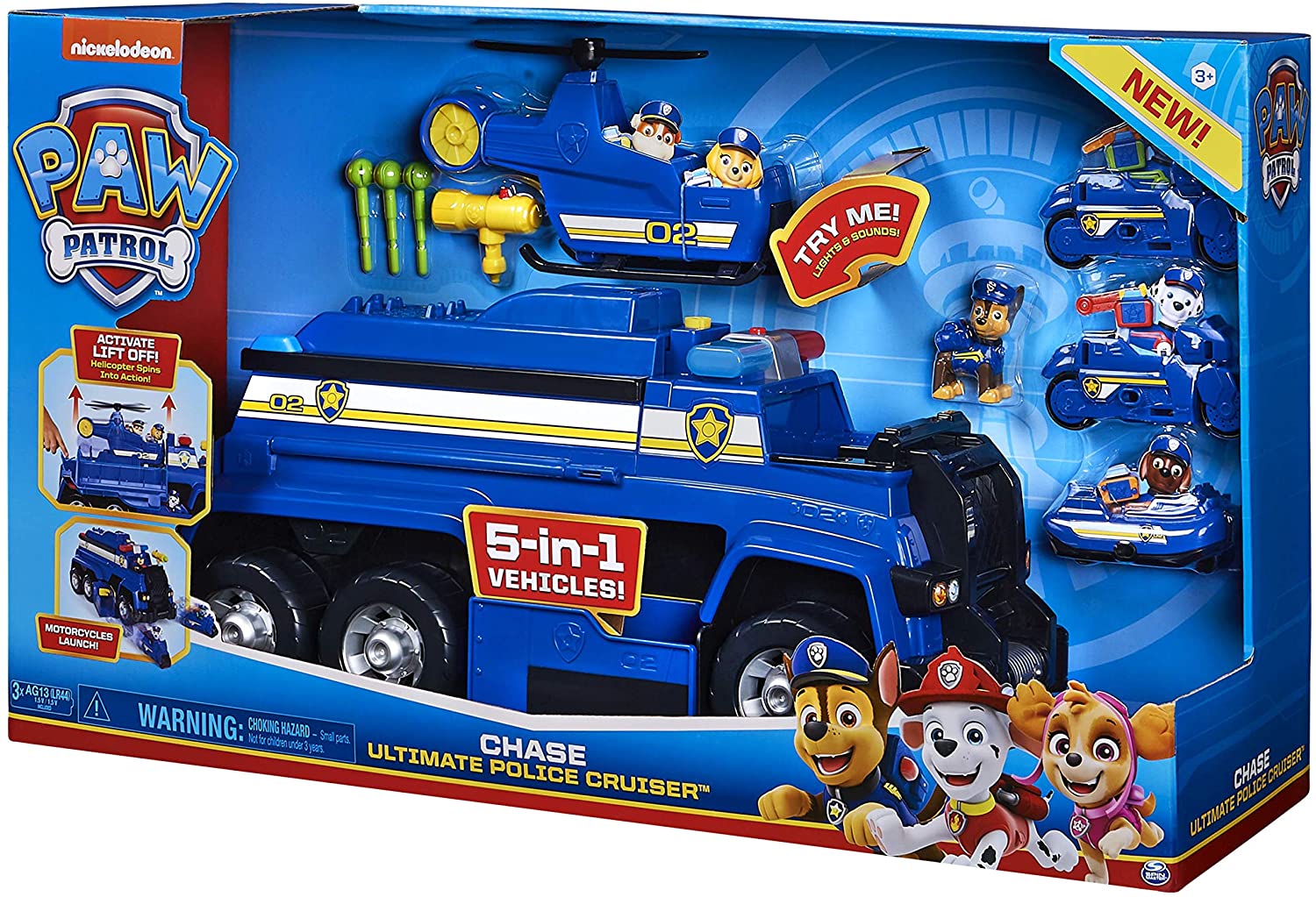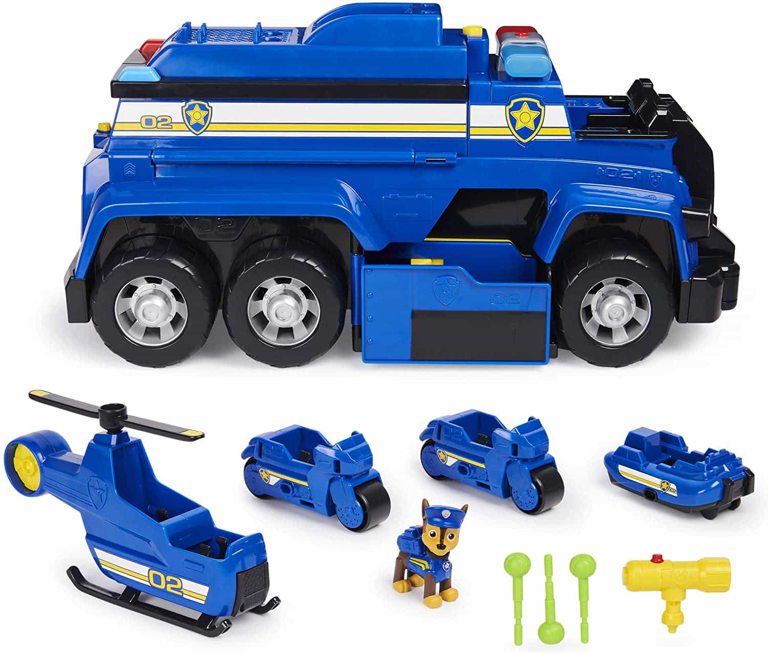 Il Mega veicolo della Polizia include al suo interno cinque veicoli: due motociclette, una barca, un elicottero e il Mega Veicolo della polizia stesso. Premendo il pulsante apposito, la parte superiore del veicolo si apre e l’ascensore funzionante fa apparire l’elicottero con eliche realmente funzionanti. Il Mega Veicolo della polizia è dotato anche di luci e suoni e un lancia proiettili posto sulla parte superiore. Per far entrare le moto in azione basta premere il pulsante posto sul lato: le fiancate si aprono e le moto vengono lanciate automaticamente, se si necessita di un supporto aereo, premendo il pulsante sul retro dell’auto si possono inviare i due cuccioli con l’elicottero. Infine, per i salvataggi acquatici, è possibile estrarre la barca dal retro.