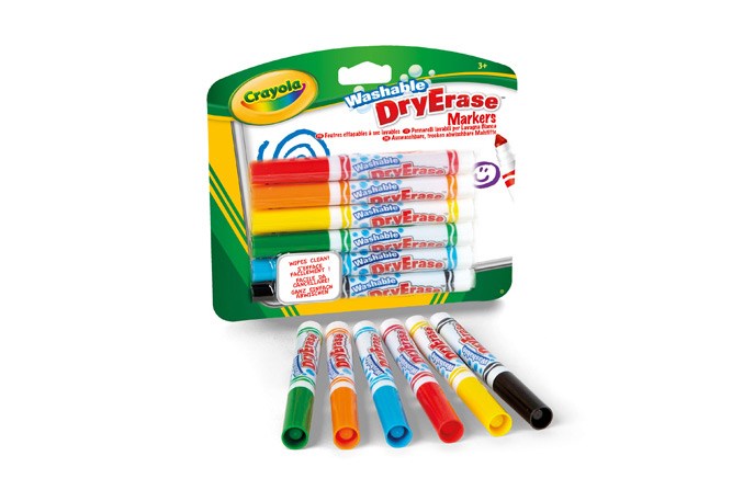 Pennarelli specifici Dry Erase per lavagna bianca lavabili in colori assortiti. Si cancellano facilmente e sono caratterizzati da un odore neutro e non sgradevole, particolarmente adatto per i bambini. Punta maxi conica, resistente e a lunga durata. Cappucci ventilati di sicurezza. Certificazione di conformità EN71.