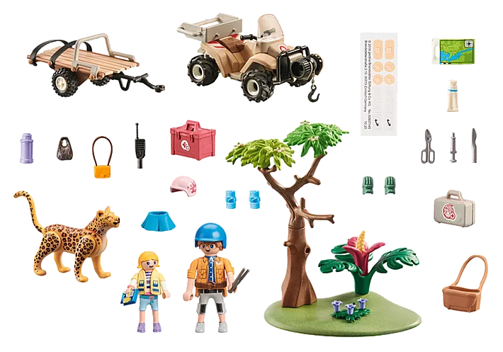 Operazione di salvataggio, un giaguaro è rimasto intrappolato da un albero caduto. A bordo del quad di soccorso animali c’è un verricello, un gancio di traino e il rimorchio. Include l’attrezzatura del veterinario, etichette per bende e scheda informativa dell’animale “Giaguaro” con fantastici contenuti audio