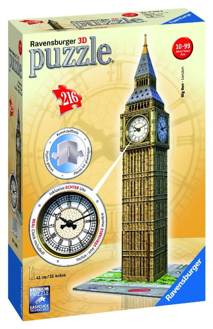 Questo puzzle 3D in plastica da 216 pezzi Ravensburger una volta completato diventa una versione in miniatura del Big Ben. La confezione include anche un meccanismo realmente funzionante che può essere inserito nel puzzle, per farlo diventare un vero e proprio orologio da tavolo.La superiorità dei puzzle Ravensburger è riconosciuta, ogni singolo pezzo è unico e si incastra perfettamente con gli altri. La qualità viene esaltata grazie a fustelle realizzate a mano, uno dei molti modi in cui Ravensburger dimostra la sua passione per l’eccellenza.