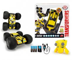 Transformers Robots in Disguise Radiocomando Flip Bumblebee scala 1:16, fantastiche acrobazie con questo radiocomando, da una parte è auto, ma quando si capovolge ha la figura del robot, 2 canali, frequenza 2,4 GHz, funzione flipping e spinning, radiocomando con volto del robot con luci e suoni, 25 cm, ricaricabile con USB, batterie incluse.